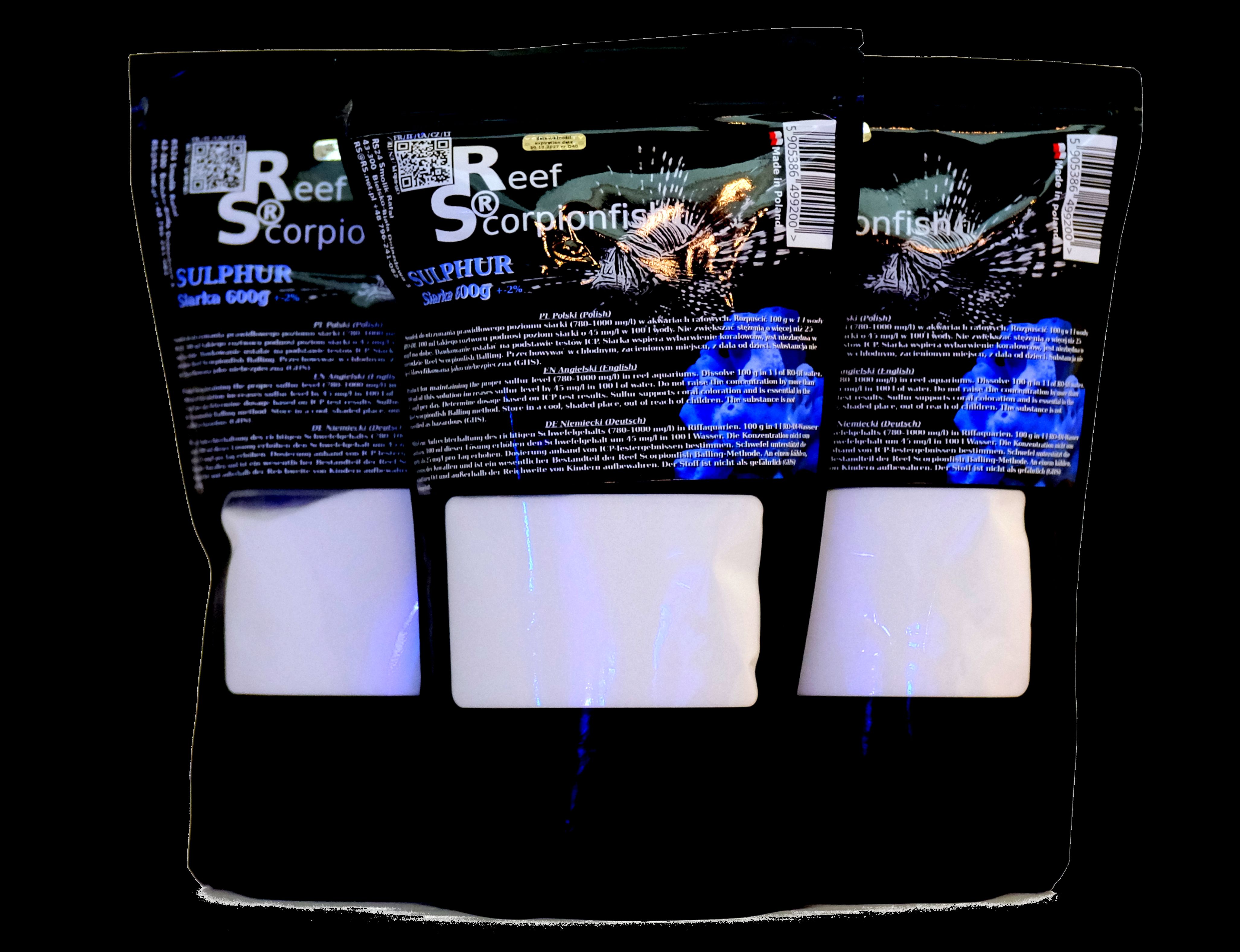 EN Angielski (English) A product intended to maintain the correct level of sulphur in reef aquariums. The optimal sulphur concentration is 780–1000 mg/l. Dissolve 100 g of the substance in 1 liter of RO-DI water. 100 ml of the prepared solution raises the sulphur level in 100 liters of water by 45 mg/l. It is not recommended to increase sulphur by more than 25 mg/l per day. Dosing should be determined based on ICP test results. Sulphur is the second most abundant element in seawater, has disinfectant properties, and positively influences coral coloration. The substance is also essential for preparing Balling solutions using the Reef Scorpionfish method. Store in a cool, shaded place out of the reach of children. The substance is not classified as hazardous according to GHS classification. Keep out of reach of children. Use only as intended. Dispose of contents/container in a properly labeled waste container.